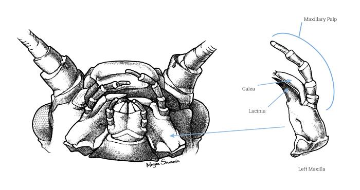 the second segment of the maxillae (second set of jaws). The lacinia, galea, and maxillary palps arise from the stipes.